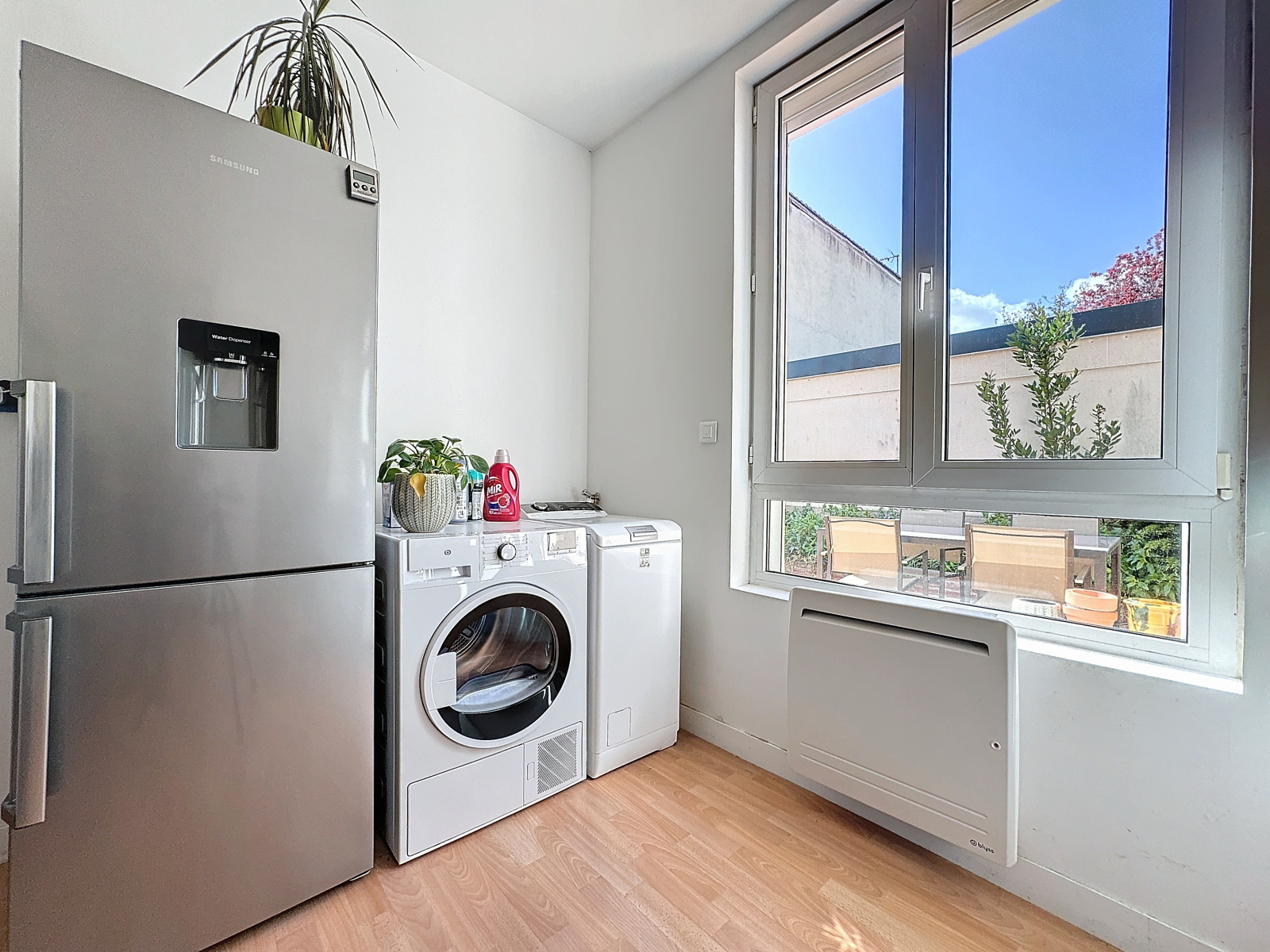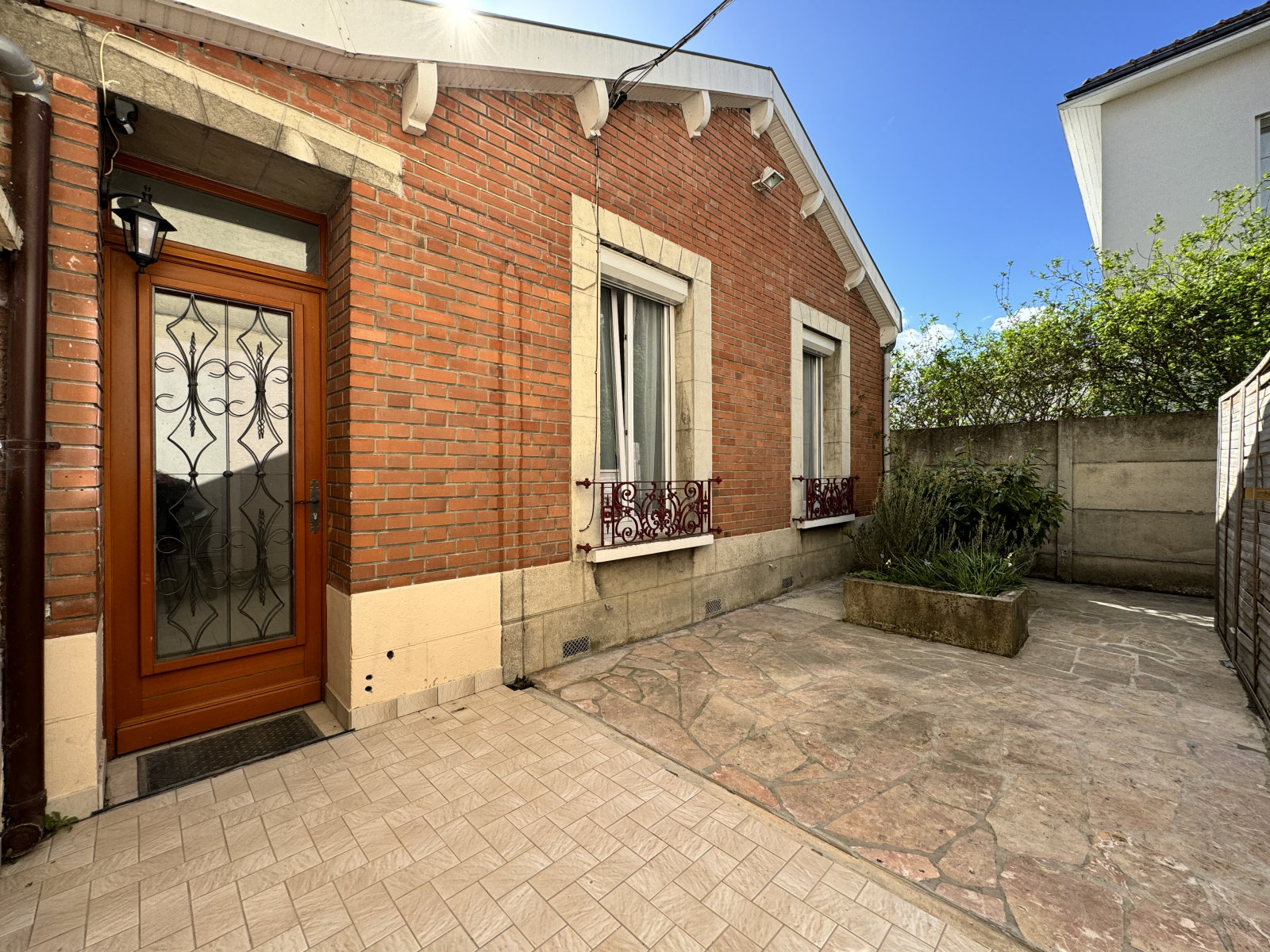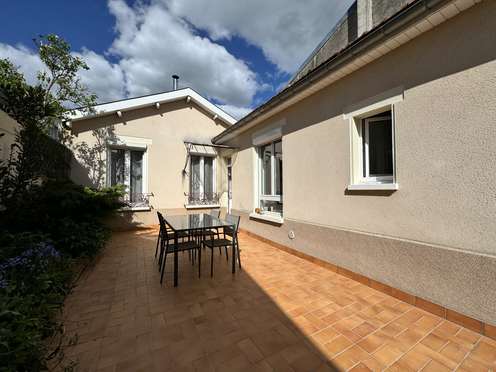 Une première terrasse à l'avant de la maison vous permet d'être en retrait de la rue, mais vous trouverez en sus à l'arrière de la maison une terrasse et un jardin tous deux exposés sud, à l'abri du bruit et des regards.
