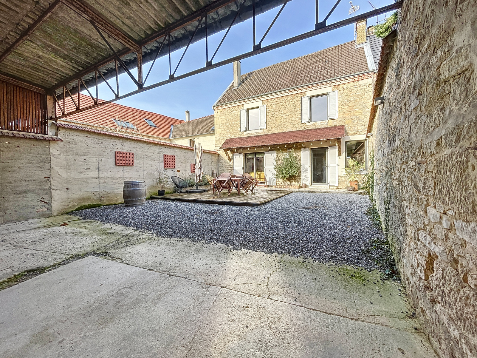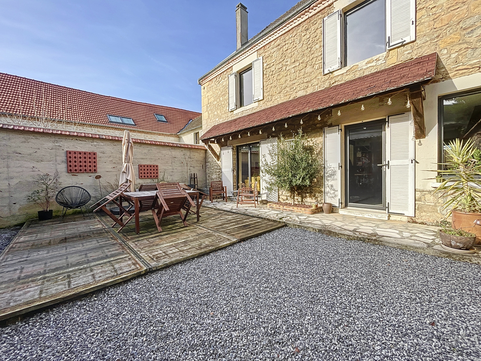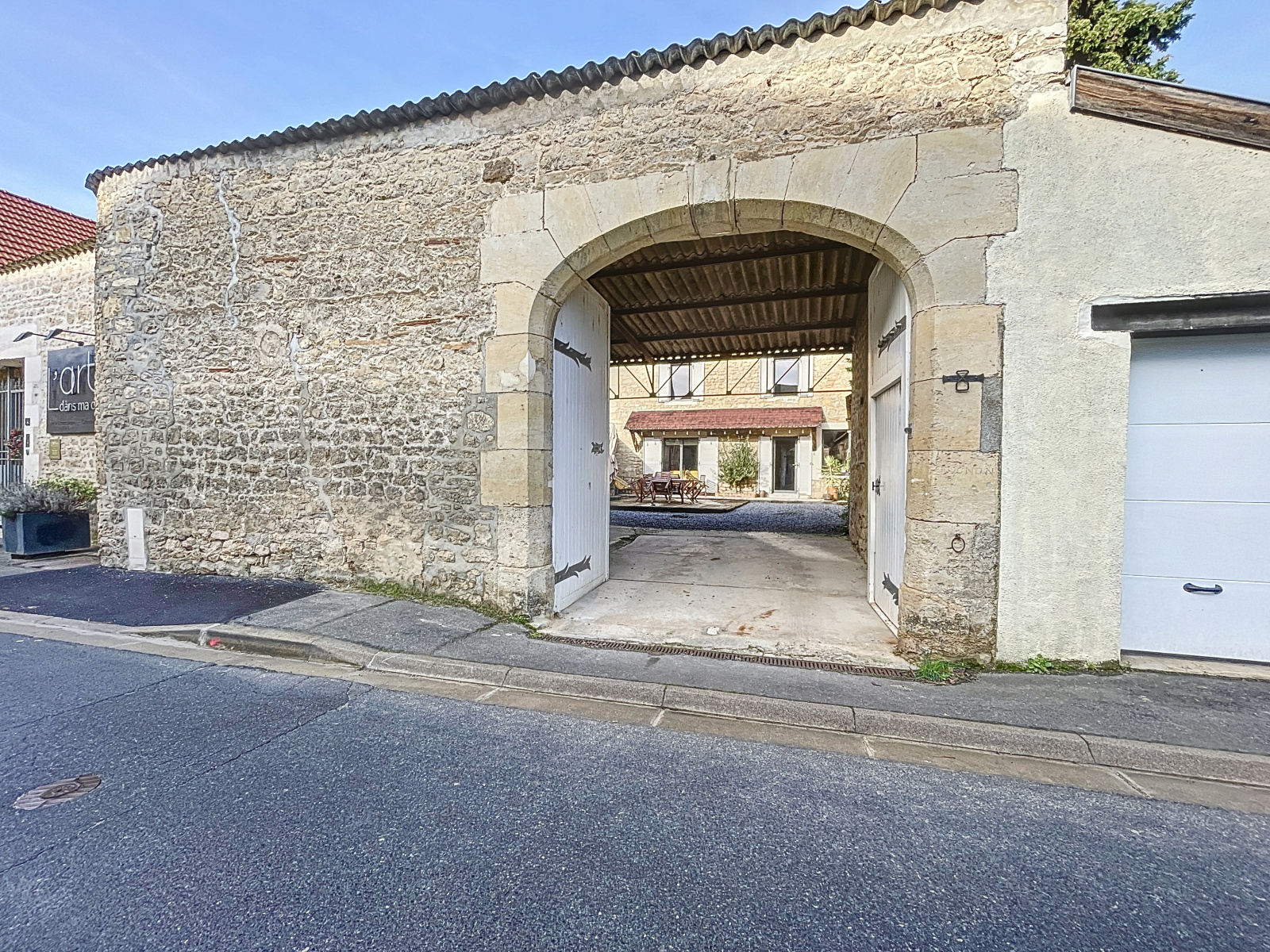 À l'extérieur un porche vous donne, de la rue, accès à une grande cour intérieure où vous trouverez une jolie terrasse bien exposée et une dépendance.