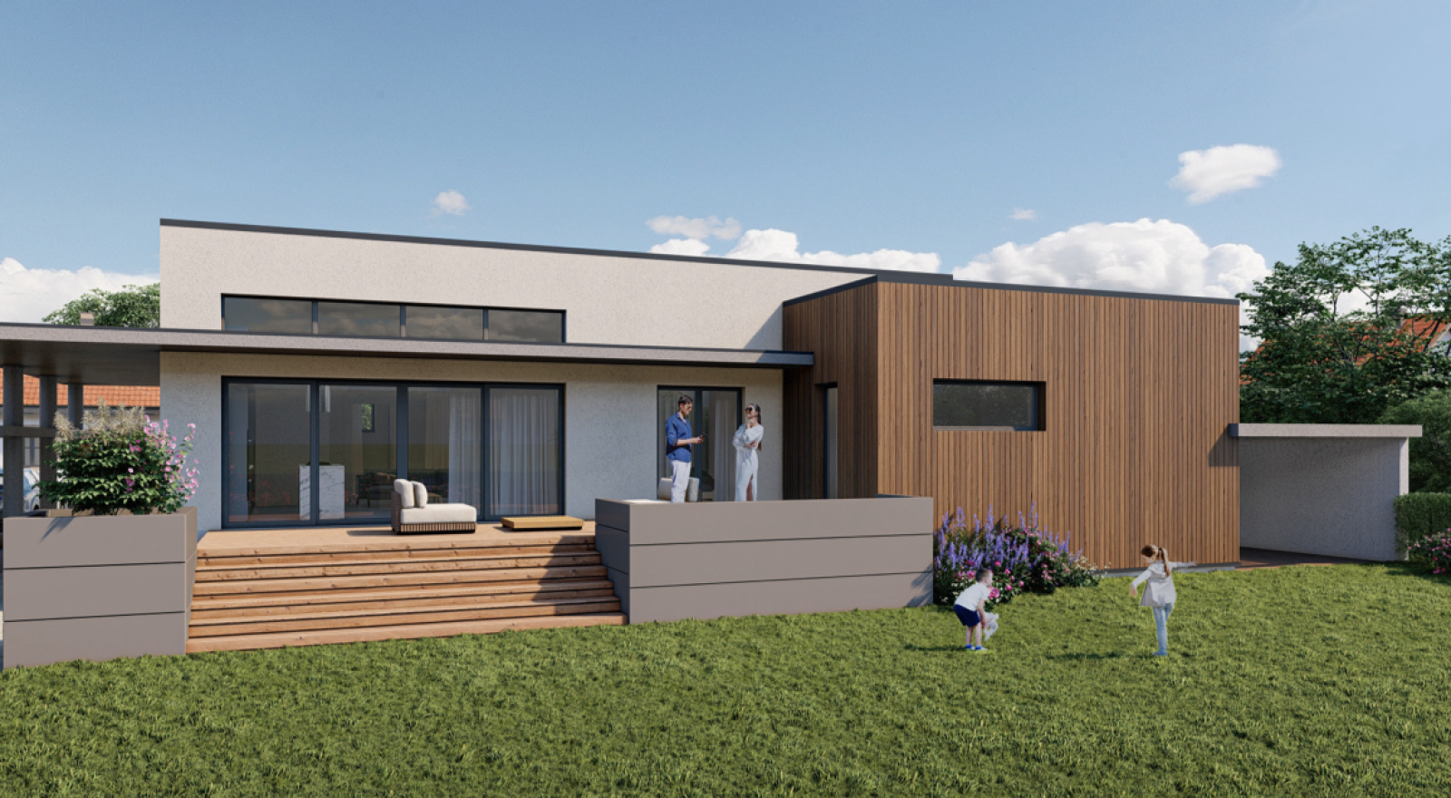 Le projet initial proyait quatre chambres et une grande pièce de vie avec cuisine ouverte et accés direct à la terrasse ainsi qu'un sous-sol aménagé (chauffage électrique et fenêtre sur l'extérieur). Le bâtiment annexe devait contenir le garage, un pool-house et une pièce de rangements.