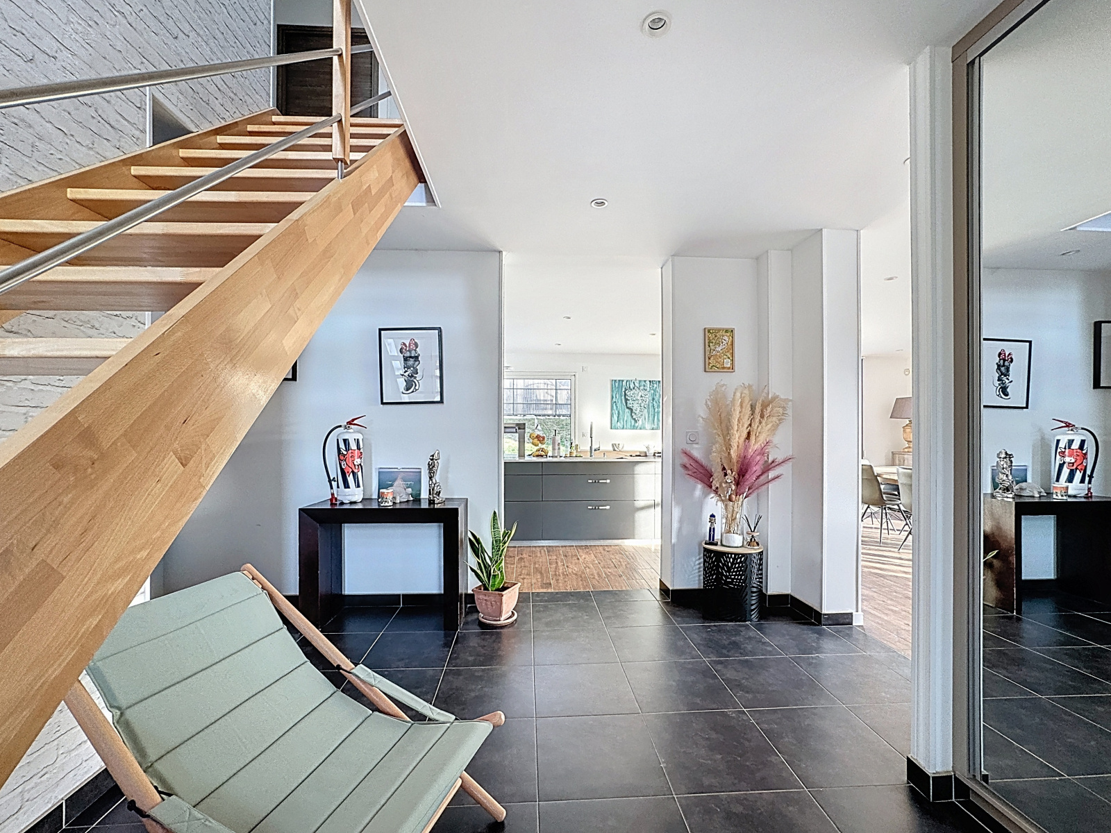 - Au rez-de-chaussée : d'une belle entrée avec placards, d'une pièce de vie baignée de lumière avec salon, salle à manger et cuisine ouverte équipée, d'une suite parentale avec dressing et salle de douches, de WC séparés et d'un cellier/buanderie.