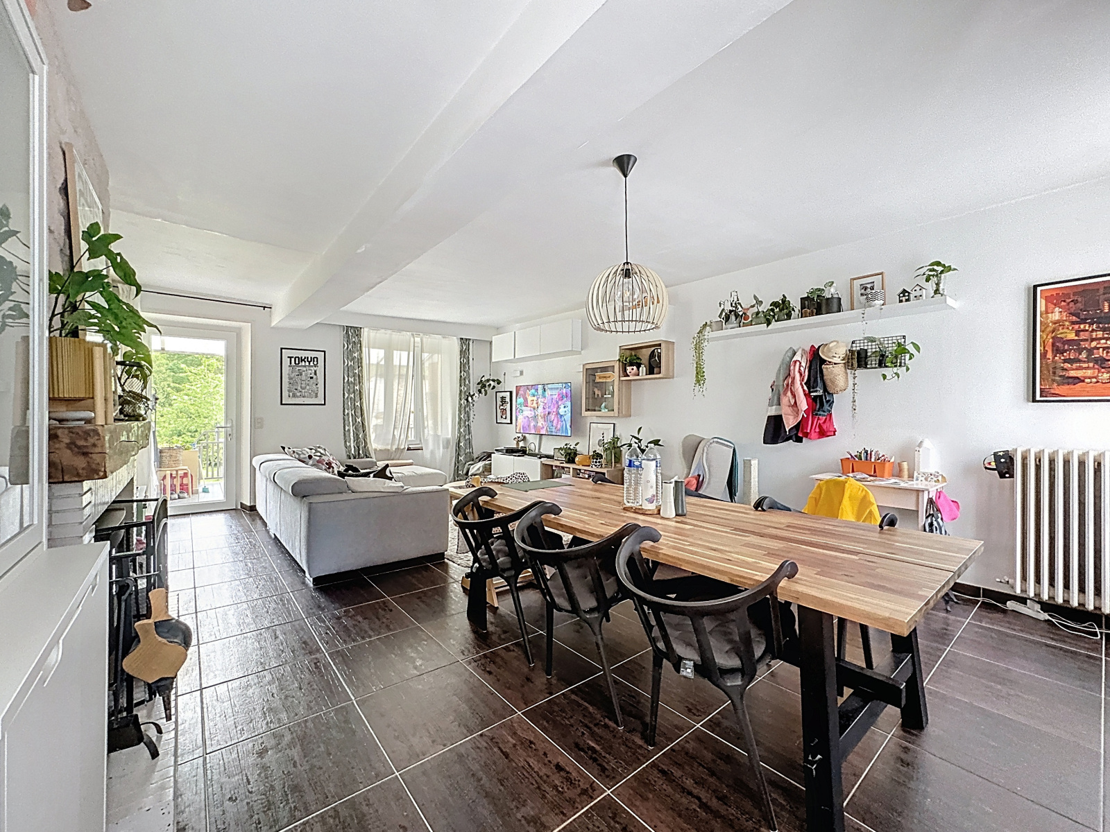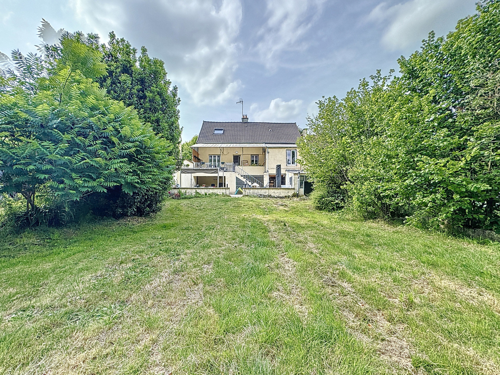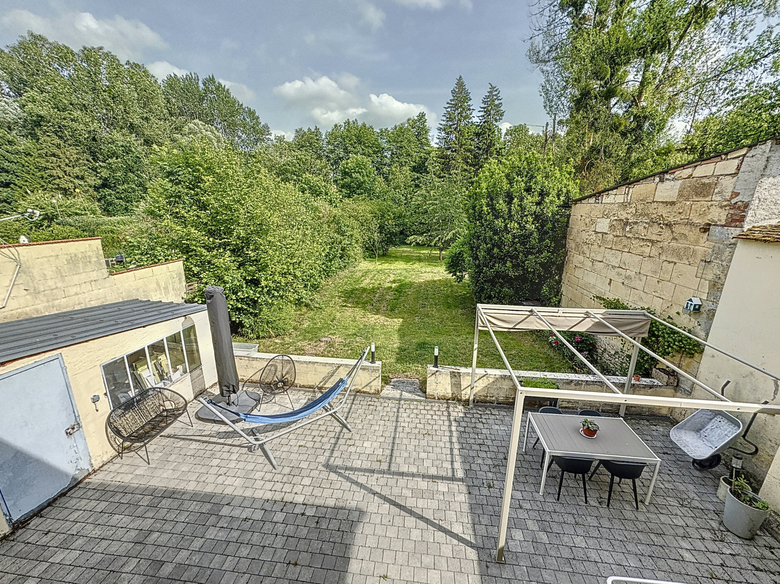 Une terrasse accessible de la pièce de vie surplombe un vaste jardin arboré sans vis-à-vis.