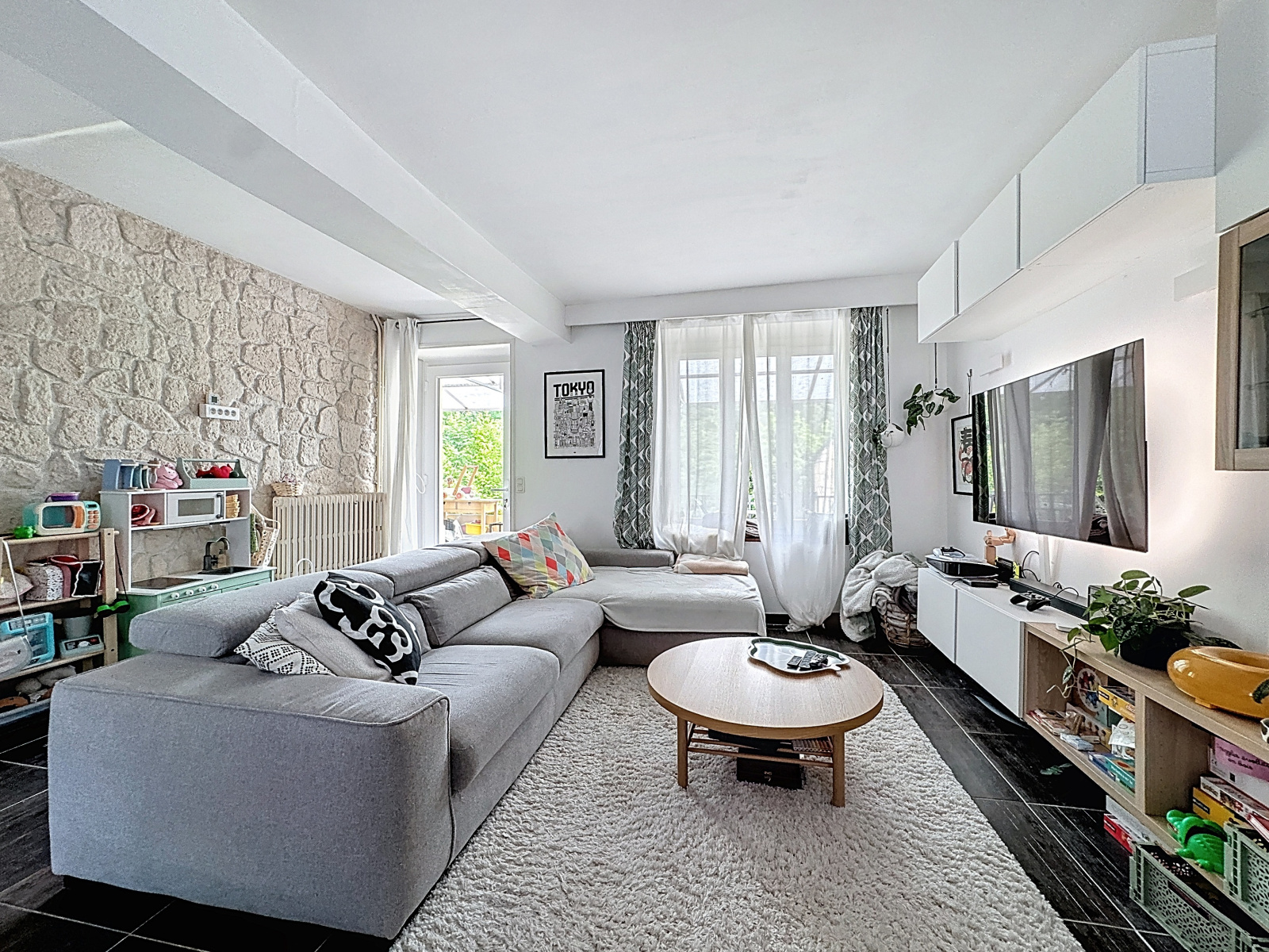 Elle se compose au rez-de-chaussée : d'une cuisine équipée, d'un salon/séjour de 34m², d'un bureau et d'une chambre avec salle de douches et WC.